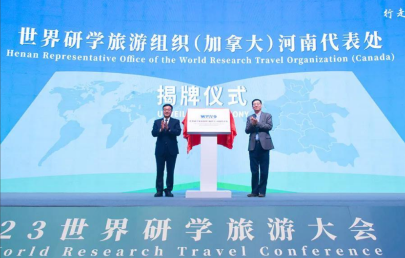 马来西亚前旅游部部长、世界研学旅游组织名誉主席黄燕燕,原联合国教科文组织地学部主任、世界研学旅游组织主席沃尔夫冈·伊德分别通过线上,向大会举办表示祝贺。会议现场,黄东升、杨林共同为“世界研学旅游组织(加拿大)河南代表处”揭牌。
