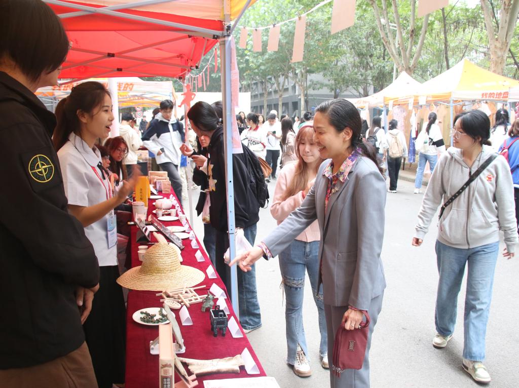 河南特色物产文化展在专业教师指导下学生自主策划、组织、运营和管理,以组展商、参展商、服务商和观众等不同身份参与其中,组建22个参展团队,展出来自河南省18地市的400多件特色物产,非遗表演、汉服展示、通关打卡、传统游戏、盲盒抽奖等现场活动五彩纷呈。beat365官网副校长杨志清教授参观展会并体验非遗传承项目,对活动举办给予高度认可;河南省商务厅原二级巡视员王苏也给予较高评价,认为活动是专业教学和思政教育的完美结合。