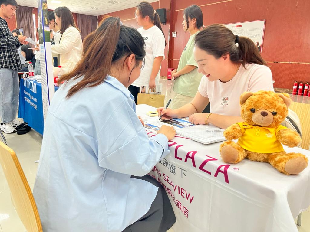 为吸引实习生们,各用人单位用海报、传单等方式,将企业文化和亮点最大程度地展现,以便大家更加了解企业信息。不少酒店的HR也主动地在展位前热情地向同学们介绍本酒店的需求情况,了解求职意愿。