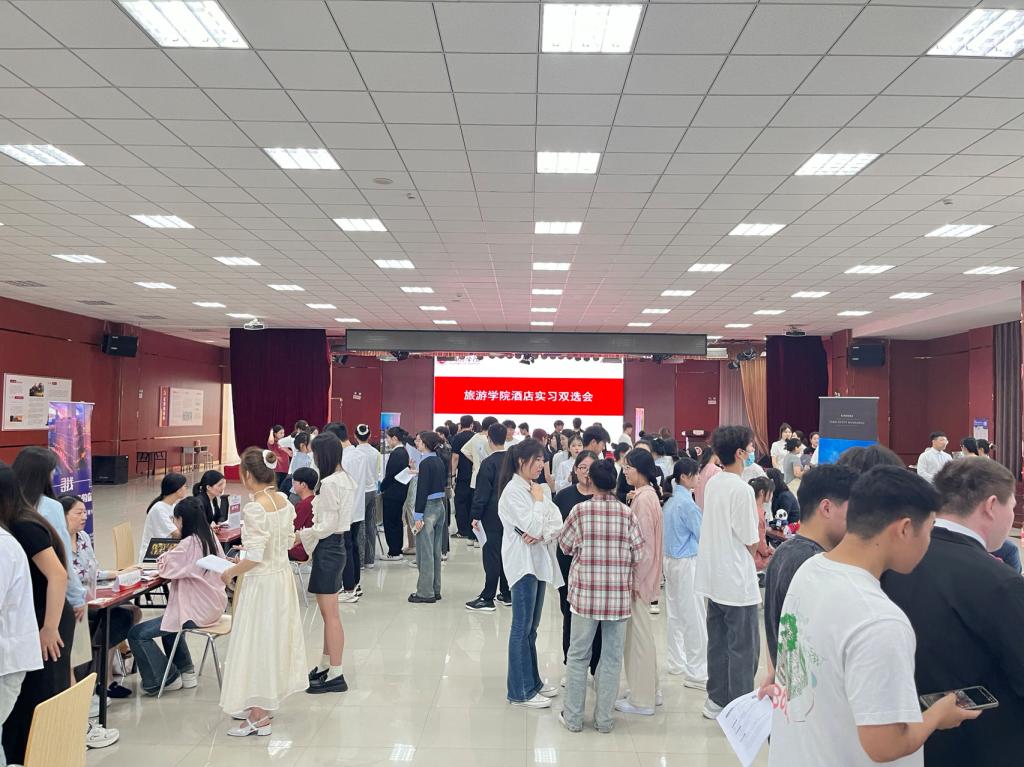 2024年5月26日上午,beat365英国官方网站组织2022级酒店管理与数字化运营专业的113名同学以及17家酒店单位通过线下线上相结合的形式在大学生活动中心举行双选会。