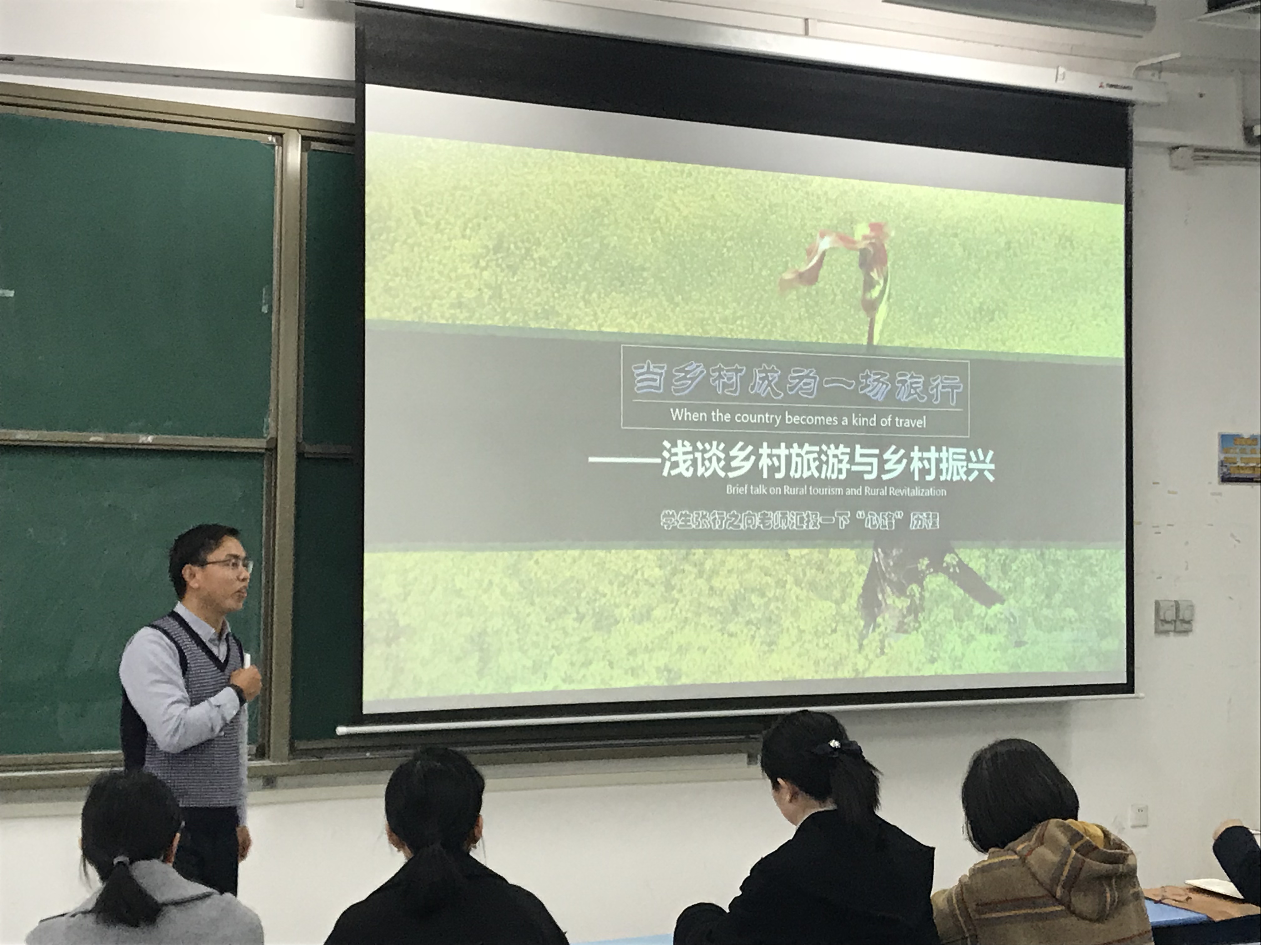 张行之院长以陶渊明《归园田居》开篇,从“我本将心向明月,奈何造化不由人——初心”、“清风知我意,无事也翻书——动心”、“白发思益壮,心玄用弥拙——用心”、“我心一片磁铁针,不指南方不肯休——真心”和“采菊东篱下,悠然见南山——归心”等五个方面进行精彩分享,让大家领略了独具风格的乡村之旅。张院长结合实际案例向beat365英国官方网站师生介绍乡村旅游规划的战略选择,如以品牌创建为发展树立典型的安徽颍上八里河、以品牌创作为特色产业赋能的重庆武隆白马山、以文化创新为民俗传承铺路的云南贡山独龙江。张院长指出旅游规划的核心是为了解决实际问题,乡村旅游规划就是要结合吸引物、产品、组织和故事等核心要素,在故乡的沃土中植入一粒种子让它生根发芽,在乡村振兴中开花结果。