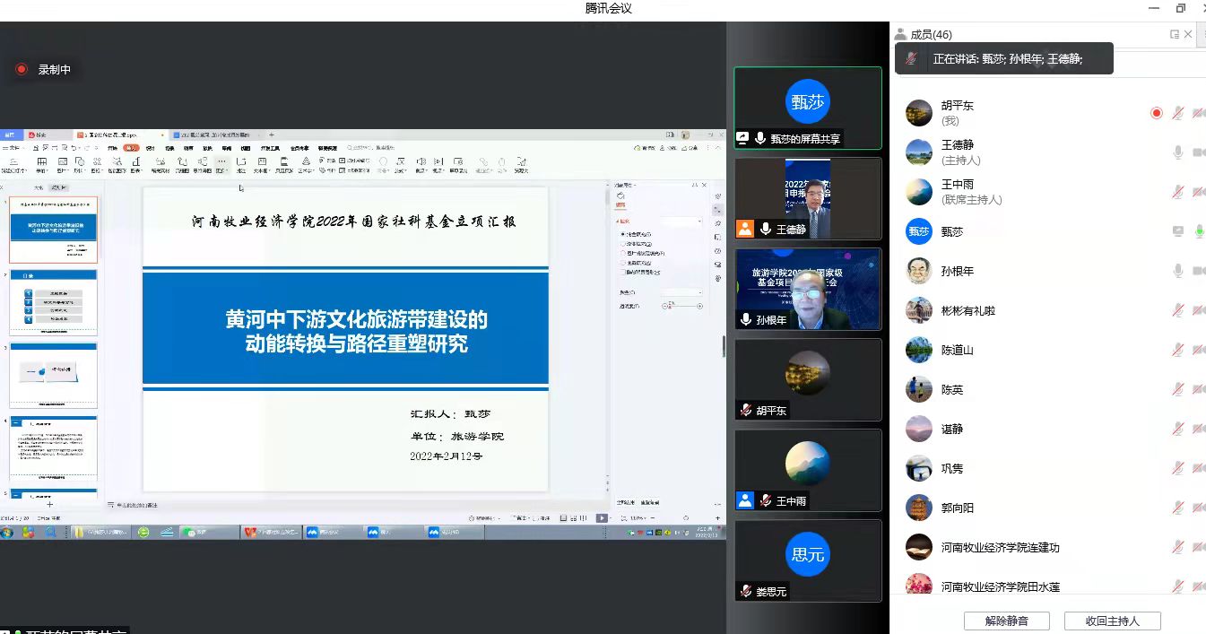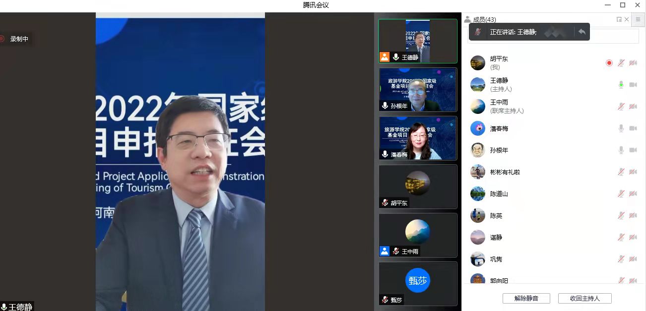 2022年2月12上午旅游学院通过腾讯会议成功召开了2022年度国家基金项目申报论证会。本次论证会邀请到陕西师范大学旅游与地理科学学院旅游管理专业博士生导师孙根年教授担任评审专家。beat365官网科学技术处处长潘春梅教授、副处长张红霞教授、社会科学管理科科长郭向阳老师所有老师出席了会议。会议由王德静院长主持。