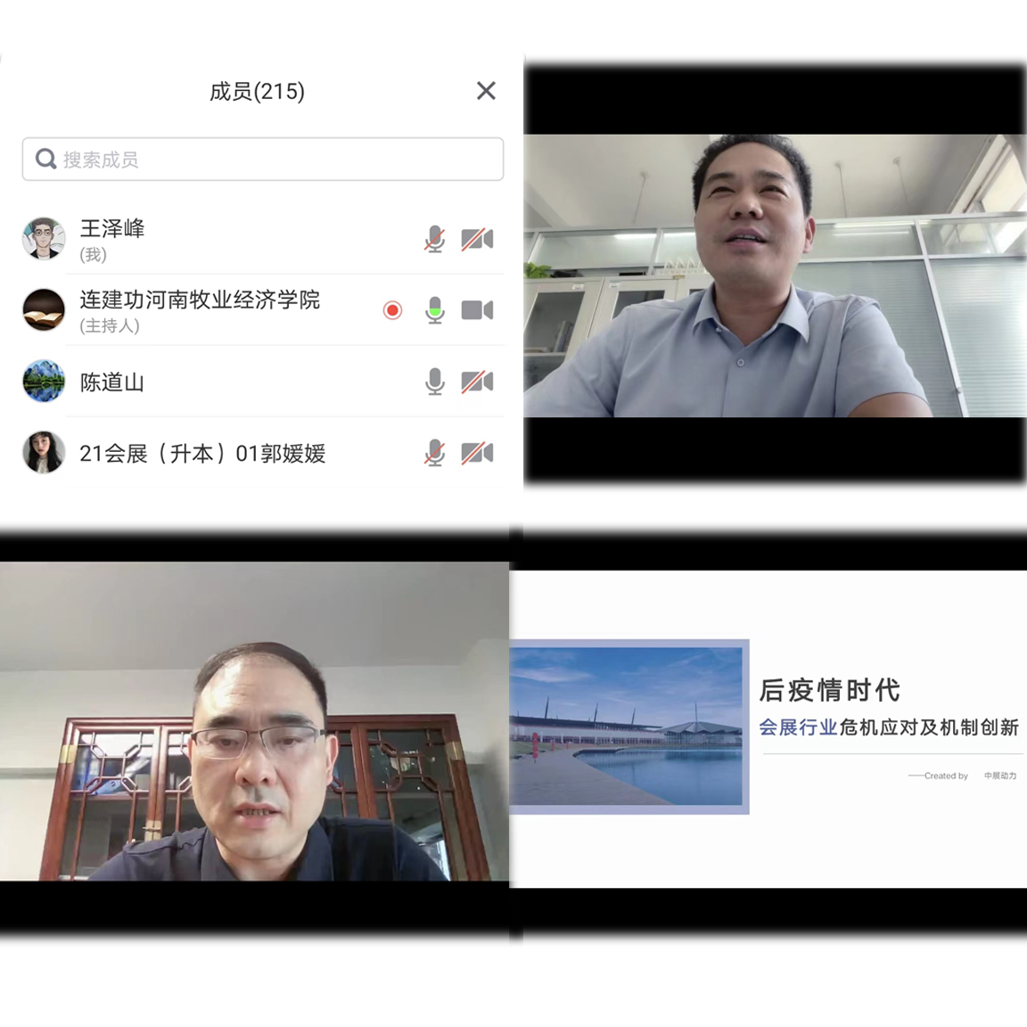 应beat365英国官方网站邀请,河南中展动力展览有限公司总经理、郑州市会展行业协会副会长、beat365英国官方网站beat365英国官方网站专业指导委员会委员宋传强先生,于9月15日下午为beat365官网师生做了一场“后疫情时代会展行业危机应对与机制创新”的线上讲座。beat365英国官方网站会展经济与管理教研室老师,21、22级会展专业学生认真聆听了讲座,讲座由学院副院长陈道山主持。