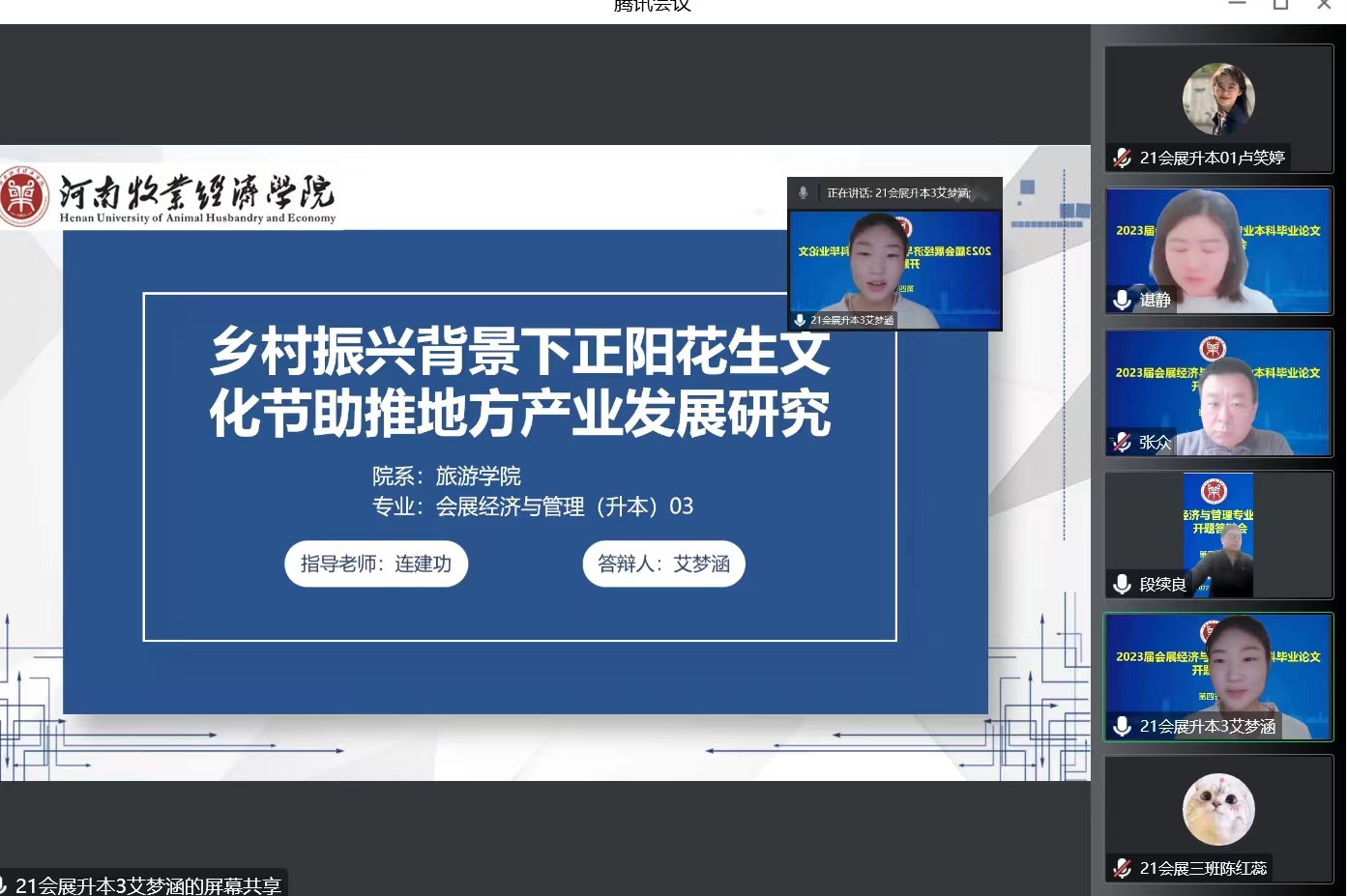 根据《beat365英国官方网站本科毕业论文(设计)工作条例》和《beat365英国官方网站2023届本科毕业论文(设计)工作实施方案》,2022年11月12日,beat365官网2023届会展经济与管理本科专业毕业论文开题答辩工作通过腾讯会议线上顺利进行,本次答辩共分8个答辩组,287名学生、48名指导教师参与答辩会。