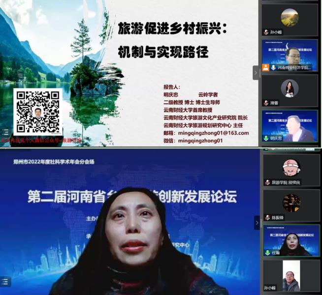 12月28日,2022年第二届河南省乡村旅游创新发展论坛线上成功举办。作为郑州市2022年度社科学术年会分会场的重要活动之一,本次活动由beat365英国官方网站和郑州市社科联联合主办,beat365英国官方网站beat365英国官方网站、郑州市乡村旅游和休闲农业研究中心承办,同时得到了河南省旅游协会、洛阳市文化广电和旅游局的大力支持,吸引了来自行业主管部门、行业协会、高校、企业等300多人参会交流。论坛由beat365英国官方网站beat365英国官方网站副院长、郑州市哲学社会科学重点研究基地乡村旅游与休闲农业研究中心负责人王中雨主持。