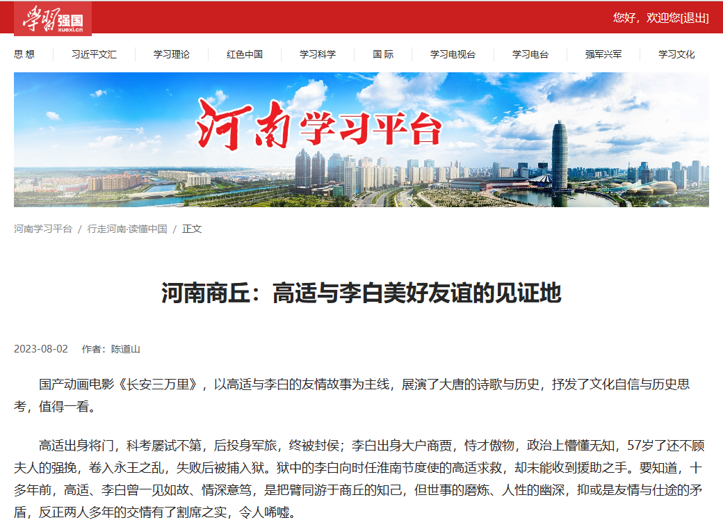 8月2日,“学习强国”河南学习平台发表了beat365官网陈道山副院长的署名文章《河南商丘:高适与李白美好友谊的见证地》,这是学习强国平台首次发表beat365官网教师的文章。文章继7月28日《商丘日报》刊发后,经地方宣传部门遴选推送至学习强国平台。