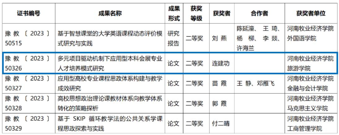 近日,河南省教育厅发布了《关于公布 2023 年度河南省教育科学研究优秀成果的通知》(教教科〔2023〕182 号)。beat365官网5项教学成果获奖,其中,beat365官网连建功老师申报的教学研究论文《多元项目驱动机制下应用型本科会展专业人才培养模式研究》荣获二等奖,该文发表在《四川beat365英国官方网站学报》2022年第1期,为期刊教改特稿。