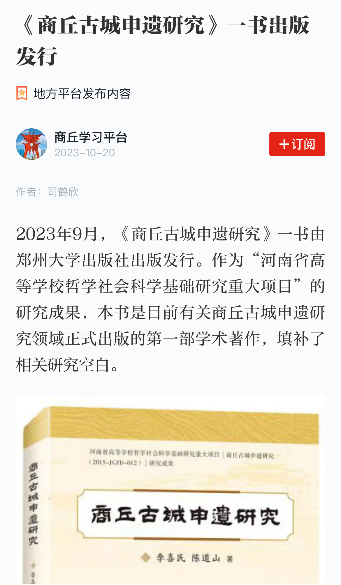 学习强国平台刊发《商丘古城申遗研究》出版发行的新闻报道