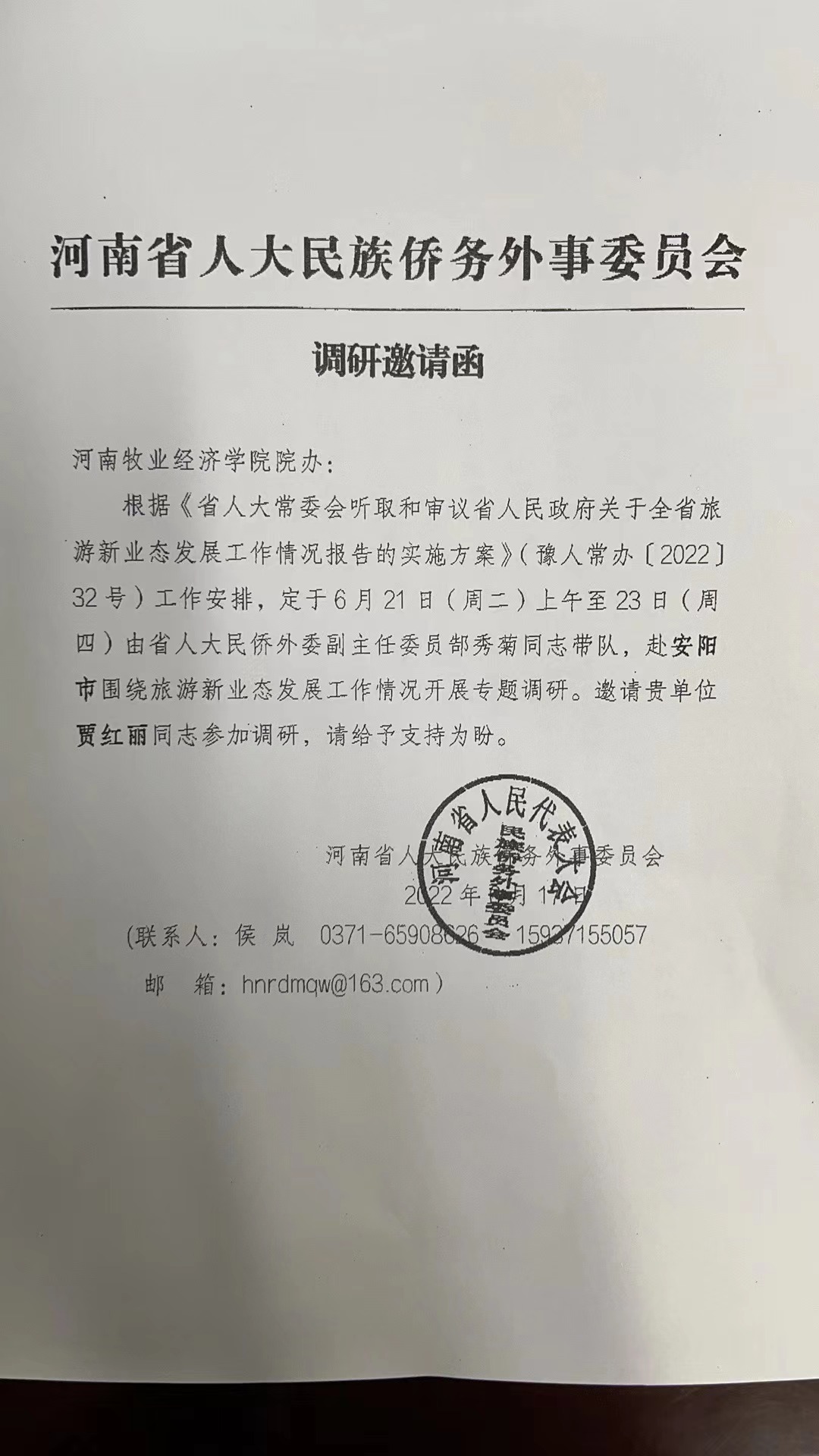6月21日—23日,应河南省人大民族侨务外事委员会邀请,beat365官网贾红丽老师随同省人大常委会调研组走进安阳就旅游新业态发展现状开展为期三天的调研调研组一行先后深入安阳县航空科普馆、林州市石板岩镇等地,实地察看民宿服务、乡村旅游等具有特色的旅游新业态发展工作情况。