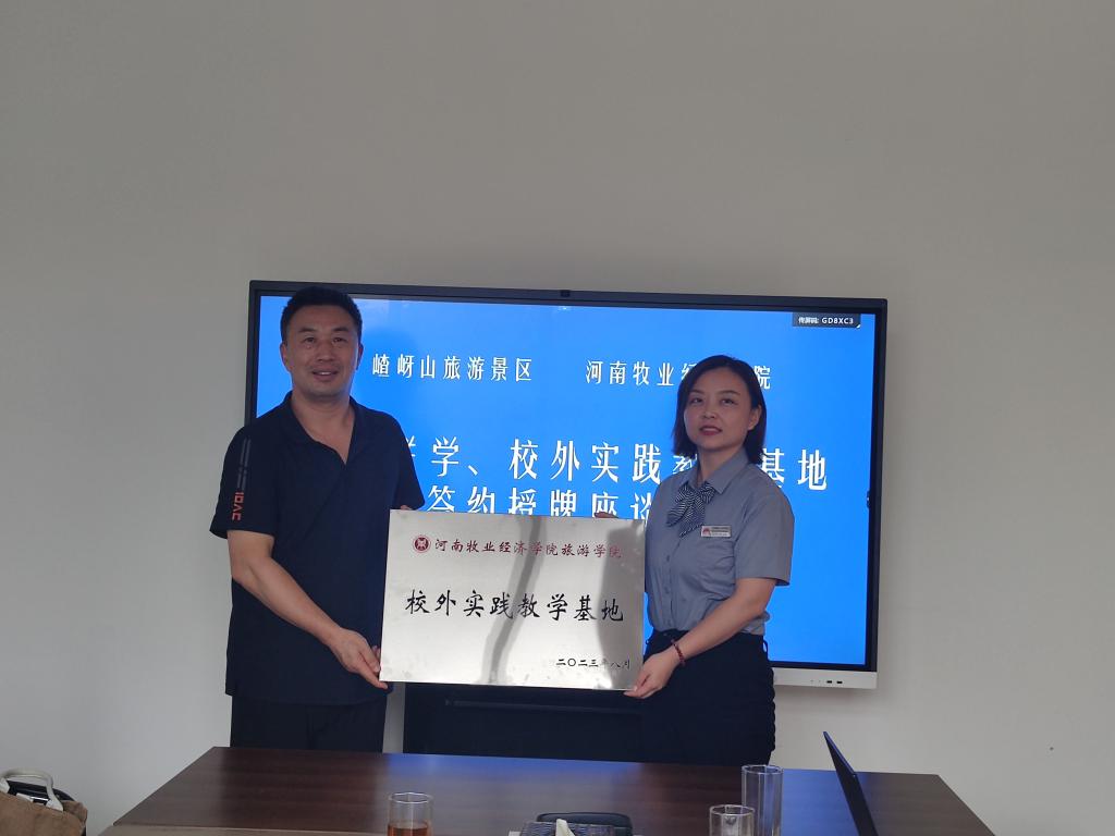 最后,权书记与王亚总经理签署了双方战略性合作协议。权书记代表学院授予嵖岈山景区为beat365官网校外实践教学基地并授牌。