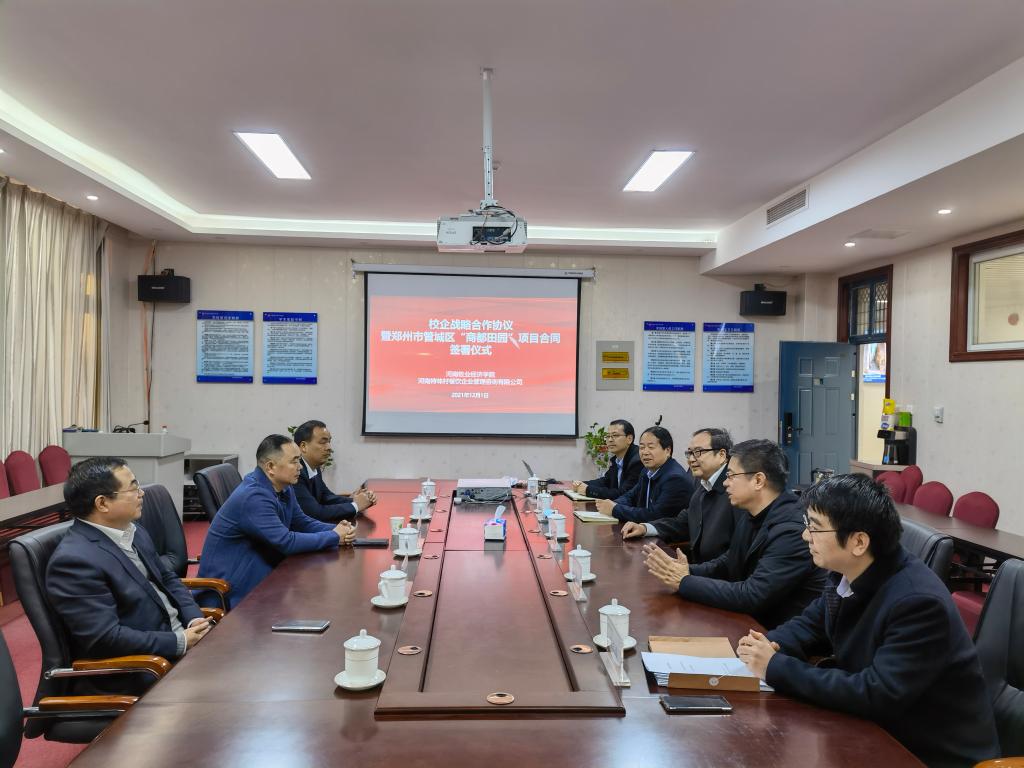2021年12月1日上午,beat365英国官方网站与河南特味村餐饮企业管理咨询有限公司校企战略合作协议暨郑州市管城区“商都田园”乡村旅游项目技术合同签约仪式在龙子湖校区尚严楼C426隆重举行。河南特味村餐饮企业管理咨询有限公司董事长韩跃军,beat365英国官方网站副校长张伟,beat365英国官方网站党委书记李喜民、院长王德静、副院长王中雨及项目组成员参加了签约仪式。