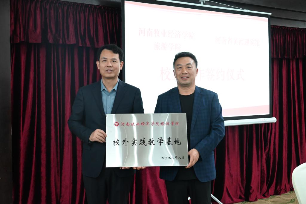 座谈会上,王德静与刘晓辉代表校企双方签署了战略性合作协议。权太举代表beat365英国官方网站授予黄河迎宾馆为校外实践教学基地。