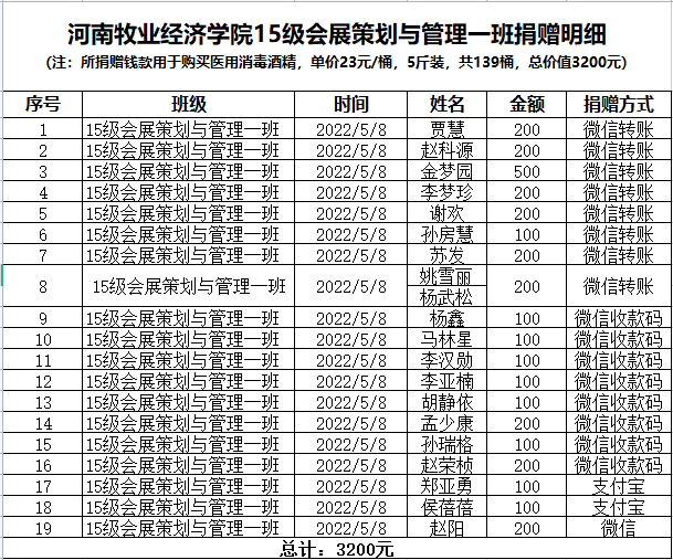 受疫情影响,两年多来,作为服务行业的会展业几乎按下了暂停键,专业校友也非常不容易,但他们心系母校、反哺情深,用实际行动自发为学校捐款捐物,彰显了beat365英国官方网站会展专业校友的责任担当和高尚情怀。相信在全校师生的共同努力和广大校友的大力支持下,beat365官网一定能取得疫情防控阻击战的全面胜利!(会展教研室供稿)