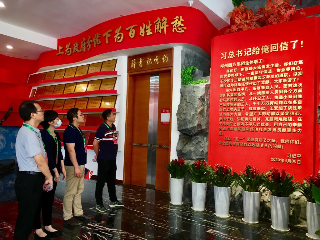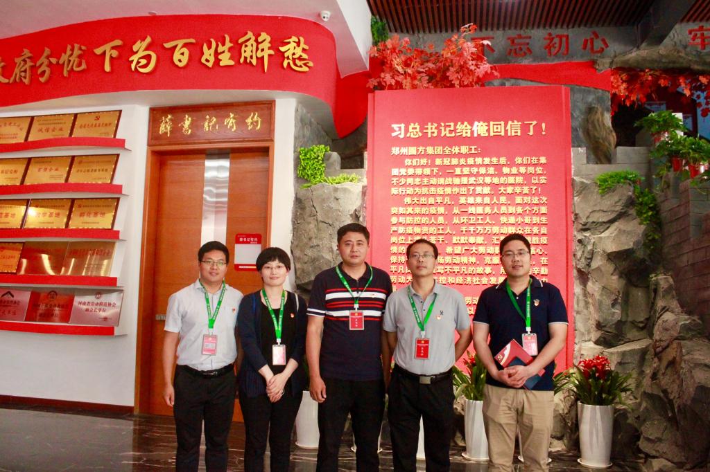 “习近平总书记给俺回信了”,圆方集团党委书记薛荣一句朴实的话充分体现了总书记真挚深厚的为民情怀和人民至上的执政理念,体现了总书记和党中央对工人阶级和广大劳动群众的亲切关怀。为深入学习宣传贯彻习近平总书记给郑州圆方集团全体职工重要回信精神,同时按照校工会有关工作要求,2020年5月25日,beat365英国官方网站组织部分党员干部赴郑州圆方集团参观学习。
