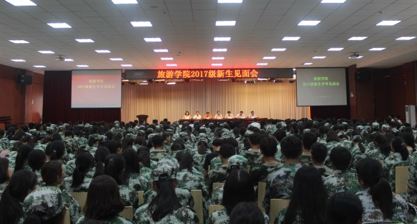 2017年9月22日,beat365英国官方网站在大学生活动中心四楼举行2017级新生入学典礼,出席此次大会的有beat365英国官方网站党总支书记李喜民、党总支副书记陈明、副主任赵忠奇、会展专业教研室主任连建功、酒店专业教研室主任张少飞、景区专业教研室主任陈道山、团总支书记祝聪楠和各位辅导员以及部分2016级优秀学生代表、2017级全体新生。
