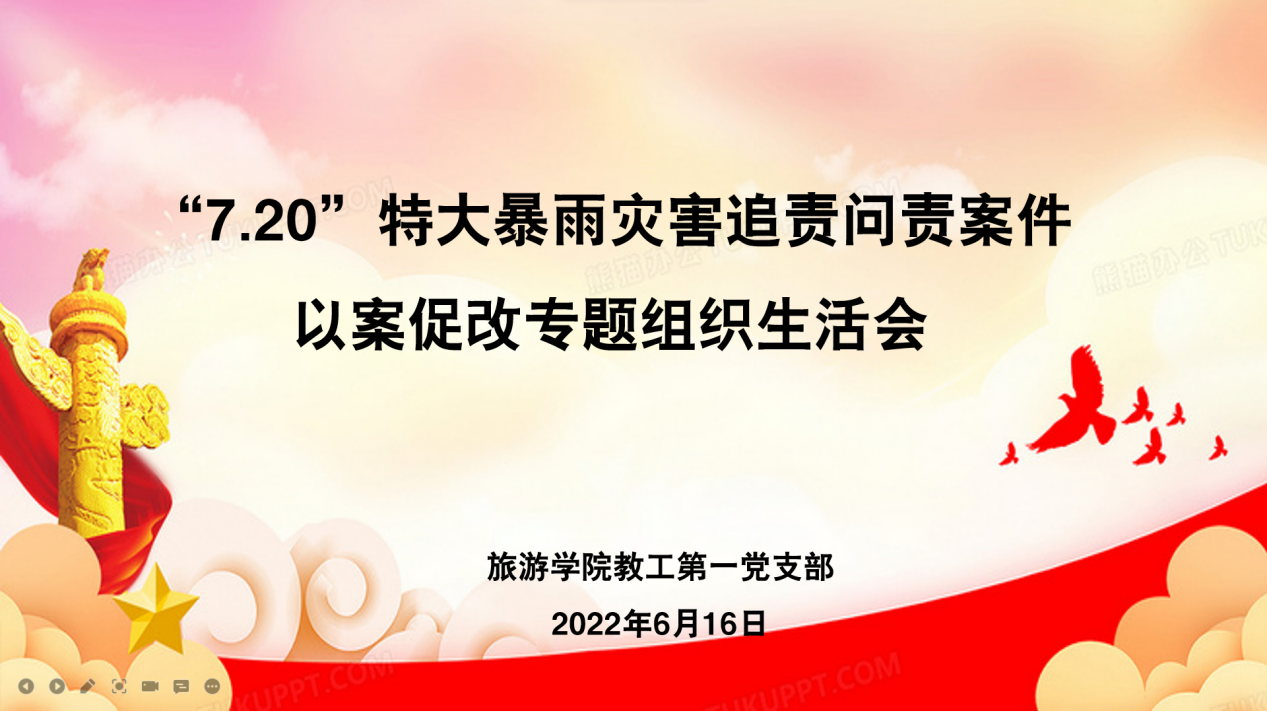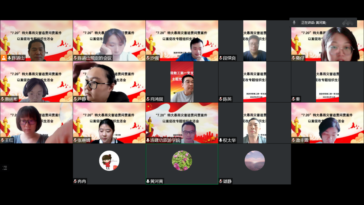 6月16日下午,旅游学院教工第一党支部利用腾讯会议召开了“7·20”特大暴雨灾害追责问责案件“以案促改”专题组织生活会,支部全体党员参加了会议,权太举书记以普通党员身份参加,会议由支部书记陈道山主持。