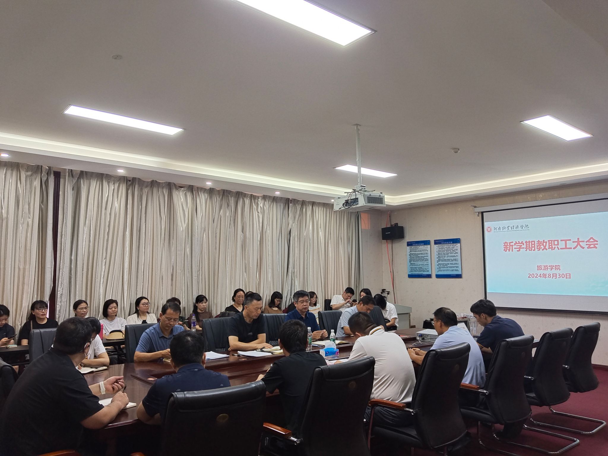 院党委书记权太举首先全面传达了校党委书记刘志伟、校长尹新明在2024年秋季学期中层干部会议的重要讲话精神,系统阐述了学校下一步的重点工作及发展思路。随后,院长王德静立足学院现状,分析了当前学院面临的形势,指出发展中存在的问题与困难,对2024年新学期工作进行了部署,并提出三点要求,一是加强政治理论学习,吃透各项政策,学以致用;二是加强工作作风,强化责任担当,高标准、严要求做好各项教育教学工作;三是杜绝躺平心态,发展壮大自身,每位教职员工都要把自身发展融入学校、学院发展大局之中,积极主动作为。