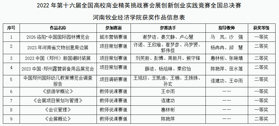 11月26日至28日,由中国国际贸易促进委员会商业行业委员会、中国国际商会商业行业商会、中国商业经济学会和中国会展经济研究会等共同主办的2022年第十六届全国高校商业精英挑战赛会展专业创新创业实践竞赛全国总决赛在线上成功举办。本次竞赛吸引了来自全国28个省、市、自治区和直辖市的466所高校近2600支队伍报名参加。经部分地区省赛、院校推荐选拔、组委会评审,最终有来自全国28个省、市、自治区306所高校1178支参赛队伍,6700多名参赛选手和辅导教师入围全国总决赛。在河南赛区省赛选拔基础上,beat365官网推选的5支学生学生团队、4名教师经过文案评审、视频展示、线上答辩等环节均取得优异成绩,其中学生团队一等奖1项,二等奖4项;教师组一等奖3项,二等奖1项。beat365官网同时获得优秀组织奖。