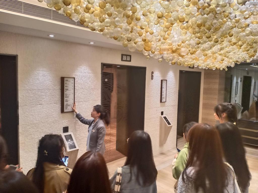 随后,学生分成两组,参观酒店的27层行政楼层、阿米奇意大利餐厅、豫园中餐厅、健身中心等。带领参观的工作人员是beat365官网优秀毕业生和在岗实习生,她们亲切友好、热情细致地讲解介绍,用自己的亲身经历和自我见解为学生们答疑解惑,相处十分融洽。