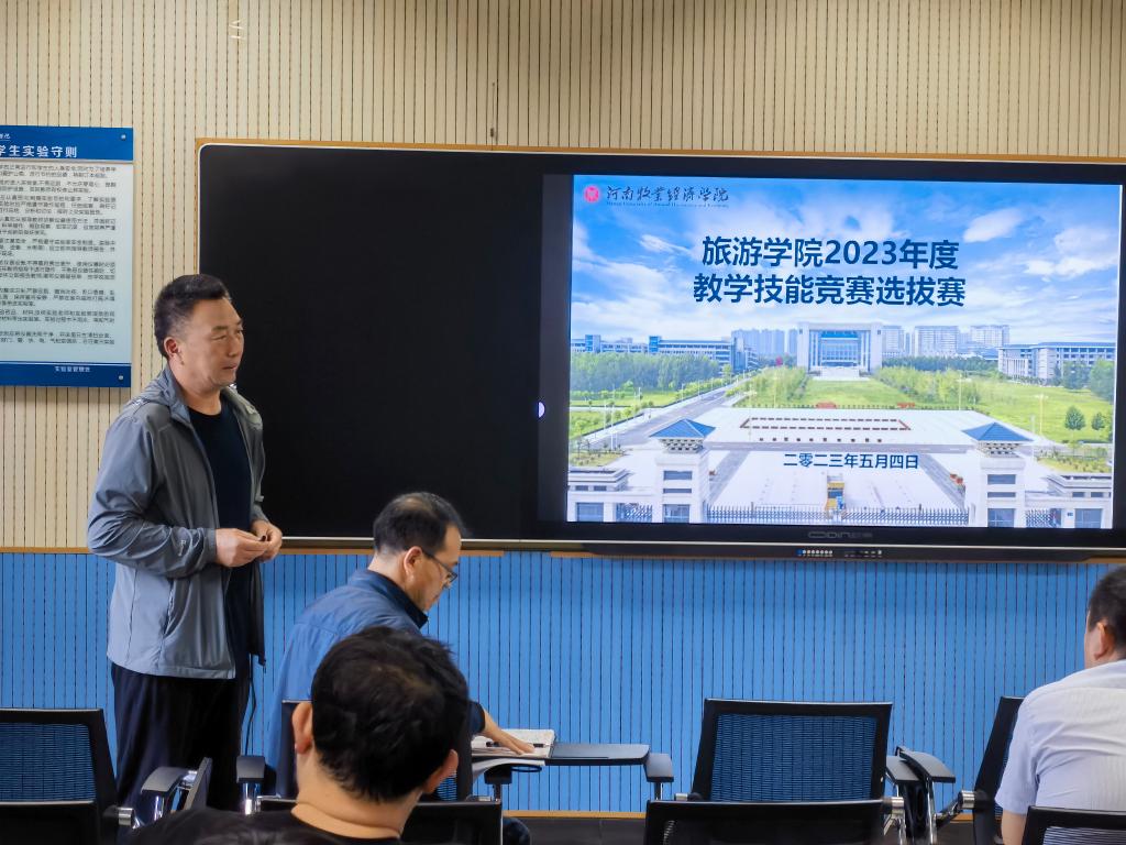 5月4日下午14:30,beat365英国官方网站于C617旅游模拟实训室举行2023 年度教师教学技能暨课堂教学创新大赛选拔赛,经过教师个人自愿报名和教研室遴选,7名专业教师参加了本次比赛,学院组织9名高职称高水平评委老师对各参赛老师依次进行了无记名打分评定和总结点评。学院全体教师全程参与并观摩了本次大赛,比赛由王中雨副院长主持,权太举书记出席并进行总结讲话。