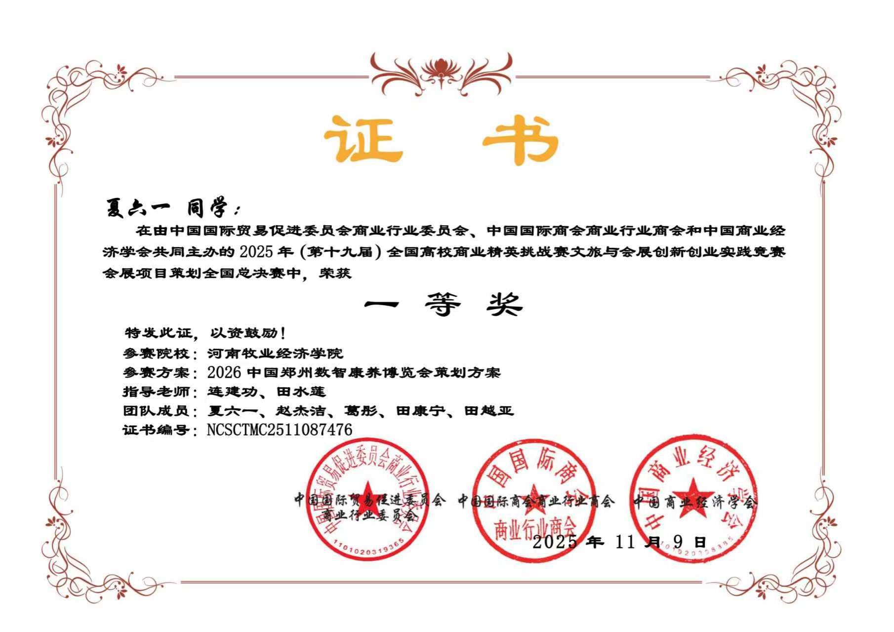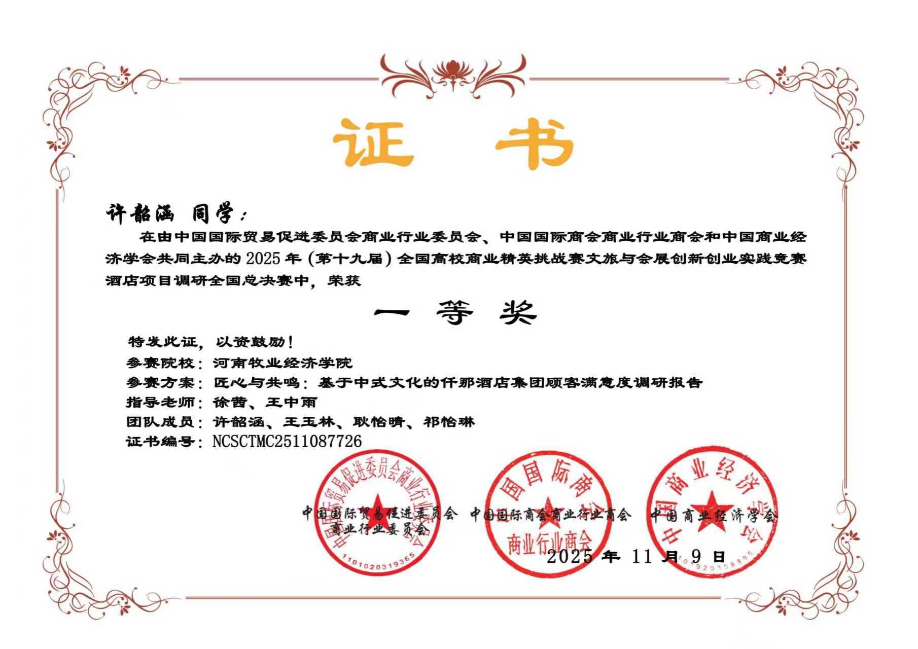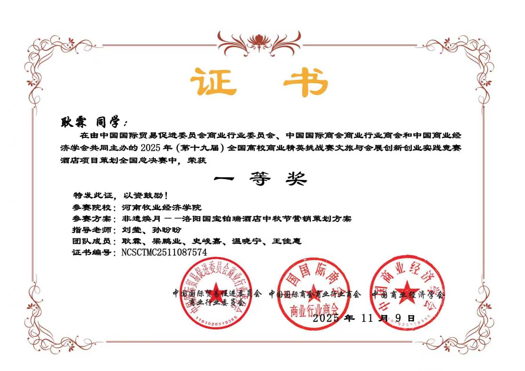 近日,由中国国际贸易促进委员会商业行业委员会、中国国际商会商业行业商会和中国商业经济学会共同主办的第十九届全国高校商业精英挑战赛文旅与会展创新创业实践竞赛全国总决赛圆满落幕。本届竞赛自2025年4月启动,历时7个月,历经知识赛、校赛、省赛选拔、全国总决赛等多个环节。经过激烈角逐,beat365官网beat365英国官方网站13支团队顺利晋升国赛,参加旅游、酒店、会展、文创四个赛道均表现优异,喜获佳绩。其中3支团队荣获一等奖,7支团队荣获二等奖,3支团队荣获三等奖。由刘莹、孙盼盼老师指导的团队凭借其在“酒店项目策划”赛道中的优异表现,成功晋级该项赛事的全国现场精英展示赛,展现了beat365官网学子在全国舞台上的竞争力与风采。