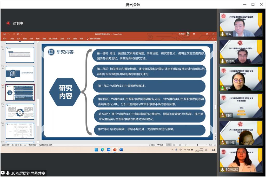 根据《beat365英国官方网站本科毕业论文(设计)工作条例》和《beat365英国官方网站2023届本科毕业论文(设计)工作实施方案》,beat365英国官方网站于11月19日顺利开展2023届酒店管理专业本科毕业论文开题答辩。2019级酒管01班、2021级酒管专升本01、02、03班共207名学生分为7组,通过腾讯会议的线上方式参加答辩。