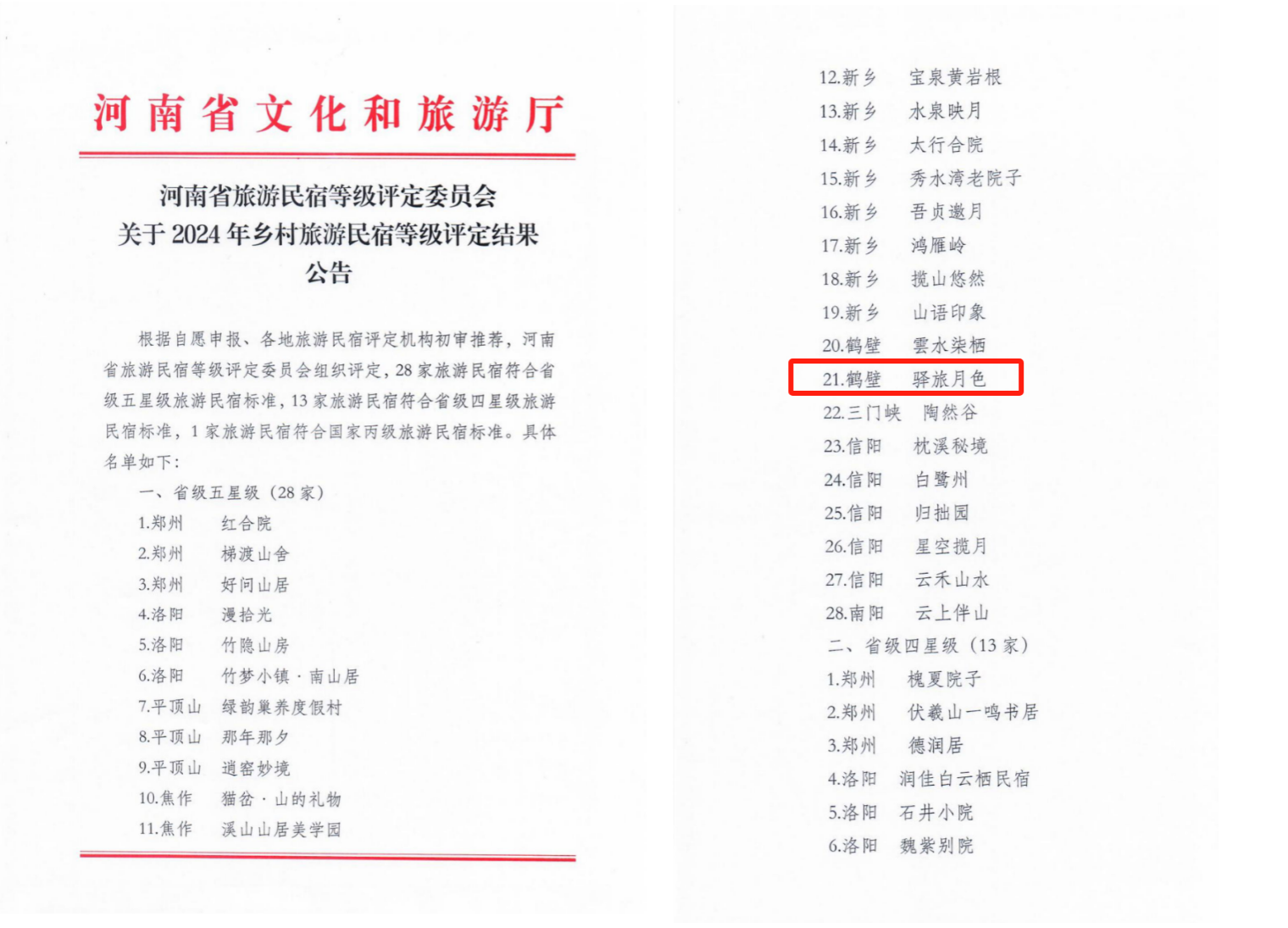 “驿旅月色”民宿集群在张众教授的指导下,积极参与河南省文旅厅组织的民宿评定工作。12月11日,河南省文化和旅游厅公布2024年乡村旅游民宿等级评定结果,“驿旅月色”获评省级五星级乡村旅游民宿。通过评定,不仅提升了自身的品牌影响力,也为河南省乡村文旅产业树立了新标杆。评定过程中,民宿集群在环境、服务、文化内涵等方面均得到了高度评价,充分说明了科技特派员对乡村文旅产业高质量发展的推动作用。
