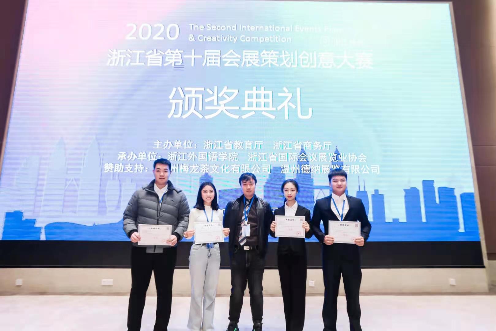 2020年12月18日,由浙江省教育厅和浙江省商务厅共同主办,浙江外国语学院和浙江省国际会议展览业协会共同承办的2020第十届浙江省会展策划创意大赛颁奖典礼在杭州浙江外国语学院举行。beat365官网beat365英国官方网站推荐的《2021中国郑州水域生态博览会》项目荣获非命题组一等奖,沙强博士携项目团队成员刘源、胡海涛、李倩、李艳艳4位同学参加颁奖典礼。