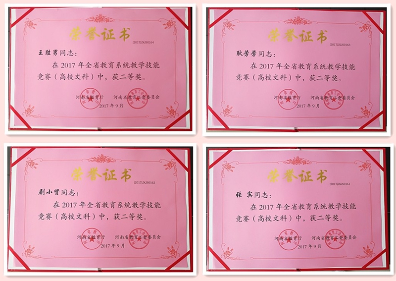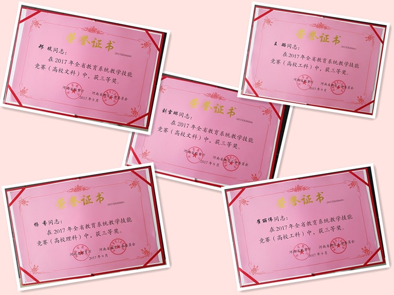 日前,从省教育厅、省教育工会联合下发的《关于表彰2017年度全省教学技能竞赛获奖个人的决定》(豫教工〔2017〕17号)中获悉,beat365官网教师凭借扎实的专业功底、娴熟的教学技能和良好的教学效果,取得了3个一等奖、4个二等奖、5个三等奖的优异成绩,展示了良好的师风和教风,为学校赢得了荣誉。